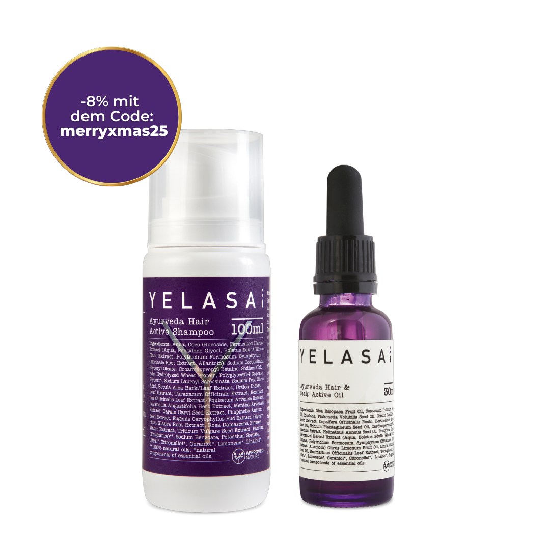 To clean hair and scalp thoroughly use our Ayurveda Hair Active Shampoo. Due to the natural herbal essences, the shampoo cleanses your scalp sustainably without irritating it, which can trigger a soothing effect on the production of fat and sebum.